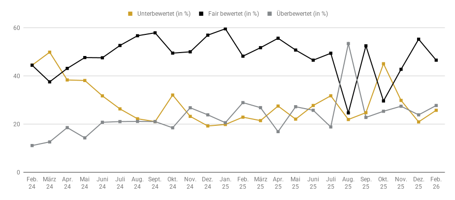 Bei der Frage zur aktuellen Bewertung der Edelmetallpreise hat sich im Februar die Ansicht leicht verstärkt, dass die Edelmetallpreise derzeit unterbewertet sind. Hier stellte sich nämlich ein Plus von 23,9 auf 25,7 Prozent ein. Eine faire Bewertung sehen derzeit 46,6 Prozent der Umfrageteilnehmer, nachdem im Januar hier noch eine Quote von 51,4 Prozent zu Buche schlug. Etwas nach oben ging es mit der Einschätzung, dass die Edelmetallpreise gegenwärtig überbewertet sind. Hier war im Februar ein Wert von 27,7 Prozent (Vormonat: 24,7 Prozent) registriert worden.