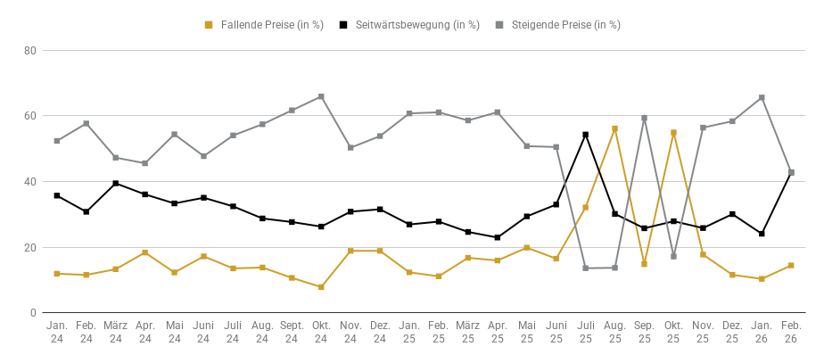 Nach den jüngsten Marktturbulenzen gab es bei der Frage nach der künftigen Preisentwicklung der Edelmetalle in den kommenden drei Monaten erhebliche Veränderungen zu beobachten. So ging es mit dem Optimismus steil bergab. Nachdem im Januar noch 65,6 Prozent der Befragten steigende Edelmetallpreise prognostizierten, brach dieser Anteil im Februar auf 42,8 Prozent regelrecht ein. Deutlich verstärkt hat sich hingegen die Meinung, dass die Edelmetallpreise seitwärts tendieren werden. Hier gab es nämlich gegenüber dem Vormonat einen kräftigen Anstieg der Quote von 24,1 auf 42,8 Prozent zu melden. Eine Minderheit von 14,4 Prozent der Anleger geht gegenwärtig davon aus, dass die Edelmetallpreise fallen werden, nachdem der Wert im Januar mit 10,3 Prozent um einiges niedriger ausgefallen war.
