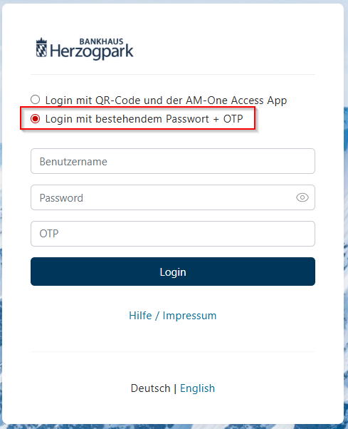 Wählen Sie bitte bis zur Migration den zweiten Punkt für den Login (Login mit bestehendem Passwort + OTP) und geben Sie Ihre Zugangsdaten wie gewohnt ein
